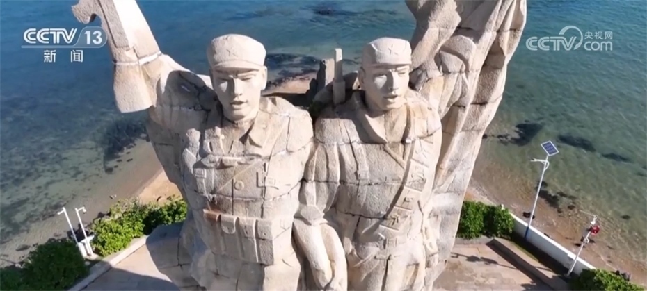 跟隨鏡頭,我們來到位于海南臨高縣北部海岸的海南解放公園,這里是解放海南渡海登陸戰(zhàn)主要登陸點(diǎn)之一。藍(lán)天碧海間,屹立著熱血豐碑紀(jì)念雕像,兩個(gè)戰(zhàn)士手拉著手,勝利吶喊,象征人民解放軍在瓊崖革命力量的大力配合下,創(chuàng)造戰(zhàn)爭史上“木船打軍艦”渡海作戰(zhàn)的壯舉。軍民共建,英勇無畏。