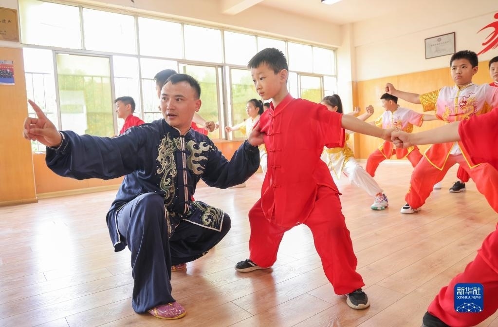 7月8日,在山東省臨沂市蘭山區(qū)一家武術(shù)館,武術(shù)老師指導(dǎo)學(xué)員練習(xí)拳法動(dòng)作。