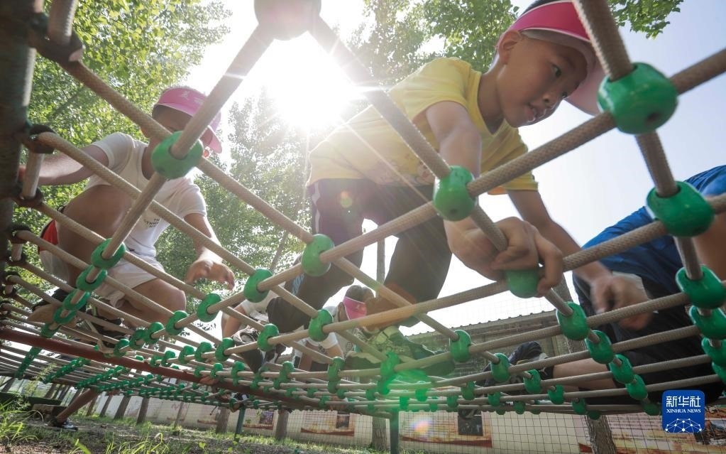 7月8日,參加少年夏令營(yíng)的孩子在河北省遵化市小廠鄉(xiāng)的訓(xùn)練營(yíng)地進(jìn)行穿越障礙訓(xùn)練。