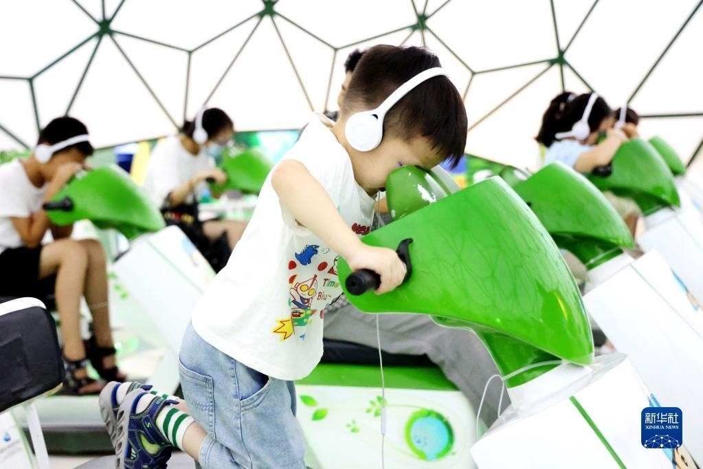 7月8日,兒童在中國(guó)杭州低碳科技館參觀體驗(yàn)。