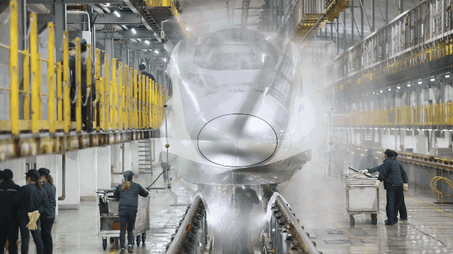 在外“奔波”了一整天的高鐵動車組回到動車所后,首先會沿著鋼軌來到洗車房“洗個(gè)澡”。當(dāng)動車通過洗車房時(shí),“機(jī)洗房”便自動開啟智能工作模式。列車以3至5公里的時(shí)速開過“澡堂”時(shí),數(shù)十個(gè)“花灑”噴嘴會給車身預(yù)濕,之后的噴嘴噴灑專用“沐浴露”,斜刷、側(cè)刷、底刷快速投入工作。