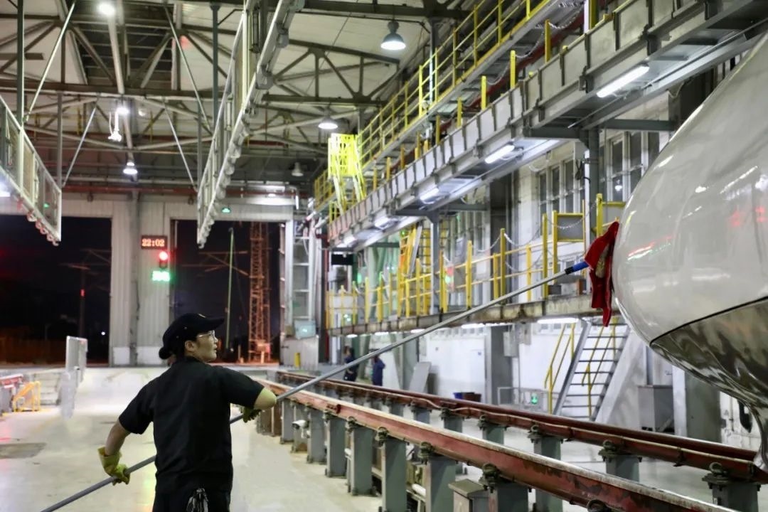 動車組經(jīng)過洗車機(jī)時(shí),調(diào)度室內(nèi)調(diào)度員精準(zhǔn)聯(lián)控司機(jī),機(jī)房有專業(yè)的設(shè)備操作人員負(fù)責(zé)監(jiān)控,確保洗車機(jī)正常運(yùn)轉(zhuǎn),外皮清洗到位。在動車檢修庫內(nèi),質(zhì)檢員全方位卡控人工清洗環(huán)節(jié),檢查清潔是否到位。
