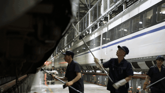 經(jīng)過自動清洗的動車組在開進(jìn)動車所檢修庫后,將由洗車人員進(jìn)行深度清潔。20多名洗車人員分工協(xié)作對動車組車頂、車身等各部位進(jìn)行清洗。