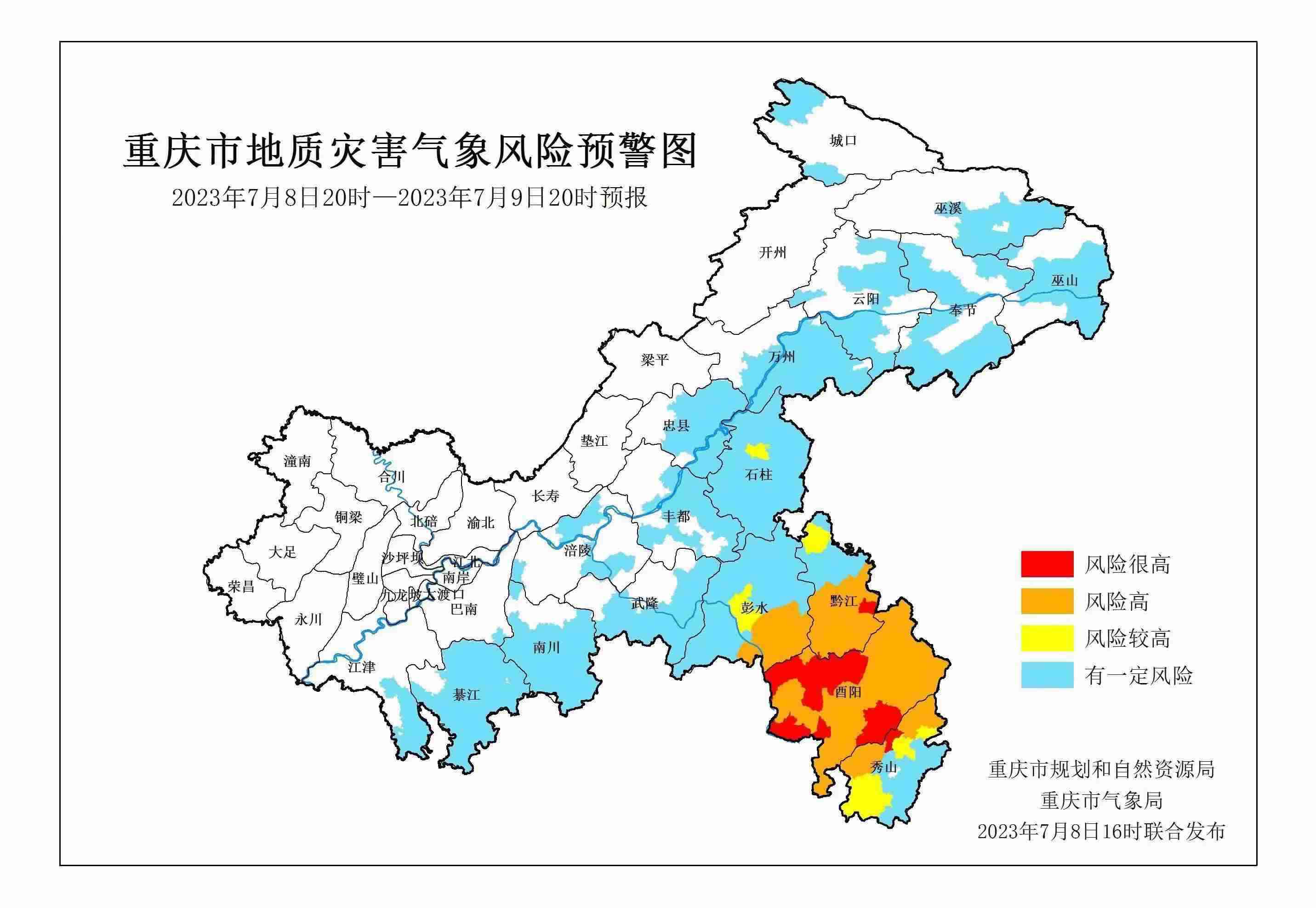 7月8日20時(shí)至7月9日20時(shí),酉陽(yáng)縣、秀山縣、黔江區(qū)屬于風(fēng)險(xiǎn)很高地區(qū),地質(zhì)災(zāi)害氣象風(fēng)險(xiǎn)等級(jí)為I級(jí)(紅色預(yù)警),彭水縣屬于風(fēng)險(xiǎn)高地區(qū),地質(zhì)災(zāi)害氣象風(fēng)險(xiǎn)等級(jí)為Ⅱ級(jí)(橙色預(yù)警),石柱縣屬于風(fēng)險(xiǎn)較高地區(qū),地質(zhì)災(zāi)害氣象風(fēng)險(xiǎn)等級(jí)為Ⅲ級(jí)(黃色預(yù)警),城口縣、萬(wàn)州區(qū)、云陽(yáng)縣、巫山縣、巫溪縣、奉節(jié)縣、忠縣、涪陵區(qū)、豐都縣、江津區(qū)、綦江區(qū)、萬(wàn)盛經(jīng)開區(qū)、南川區(qū)、武隆區(qū)、巴南區(qū)屬于有一定風(fēng)險(xiǎn)地區(qū),地質(zhì)災(zāi)害氣象風(fēng)險(xiǎn)等級(jí)為Ⅳ級(jí)(藍(lán)色預(yù)警)。