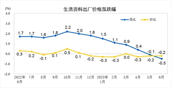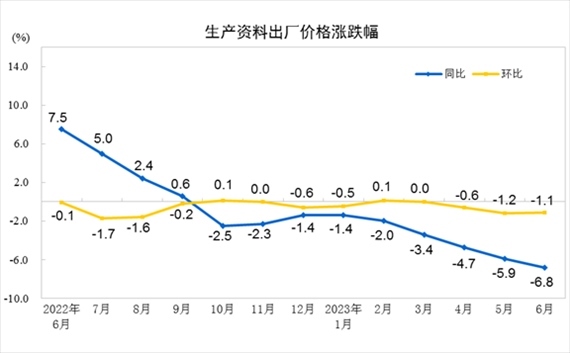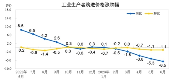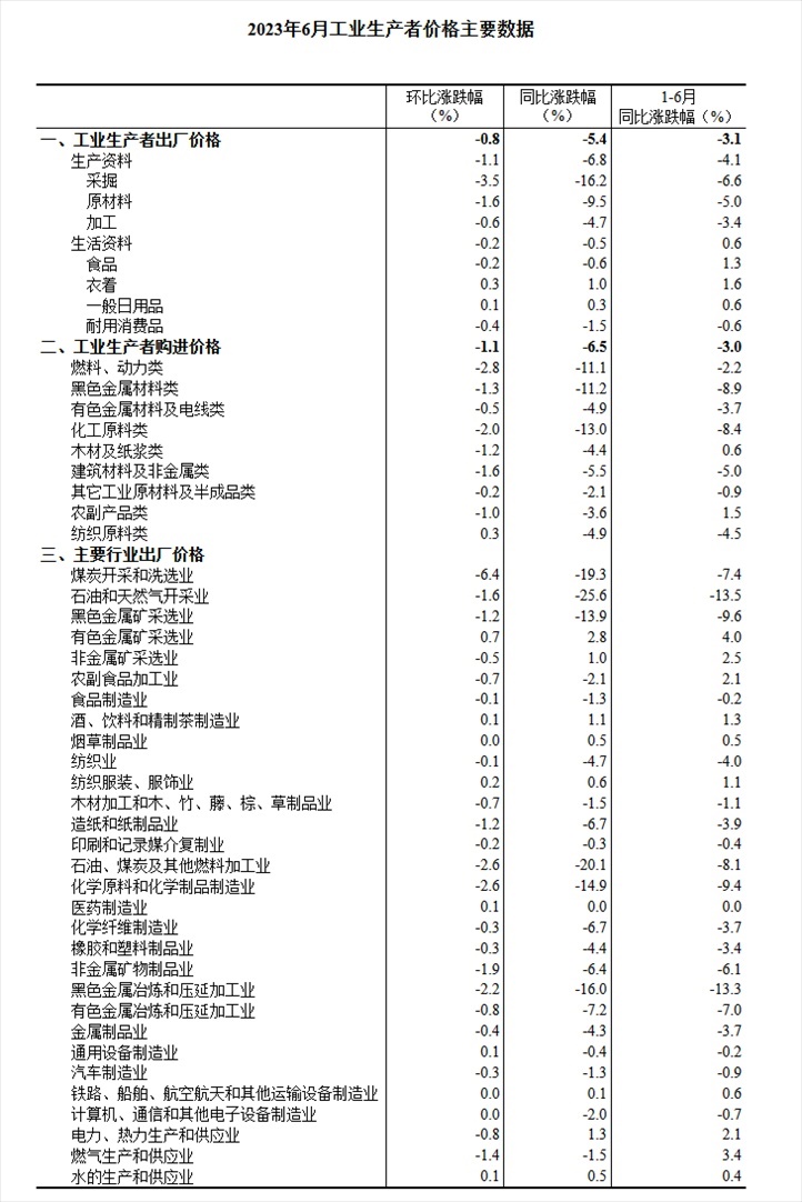 央視網(wǎng)消息:據(jù)國家統(tǒng)計(jì)局網(wǎng)站消息,2023年6月份,全國工業(yè)生產(chǎn)者出廠價格同比下降5.4%,環(huán)比下降0.8%;工業(yè)生產(chǎn)者購進(jìn)價格同比下降6.5%,環(huán)比下降1.1%。上半年,工業(yè)生產(chǎn)者出廠價格比上年同期下降3.1%,工業(yè)生產(chǎn)者購進(jìn)價格下降3.0%。