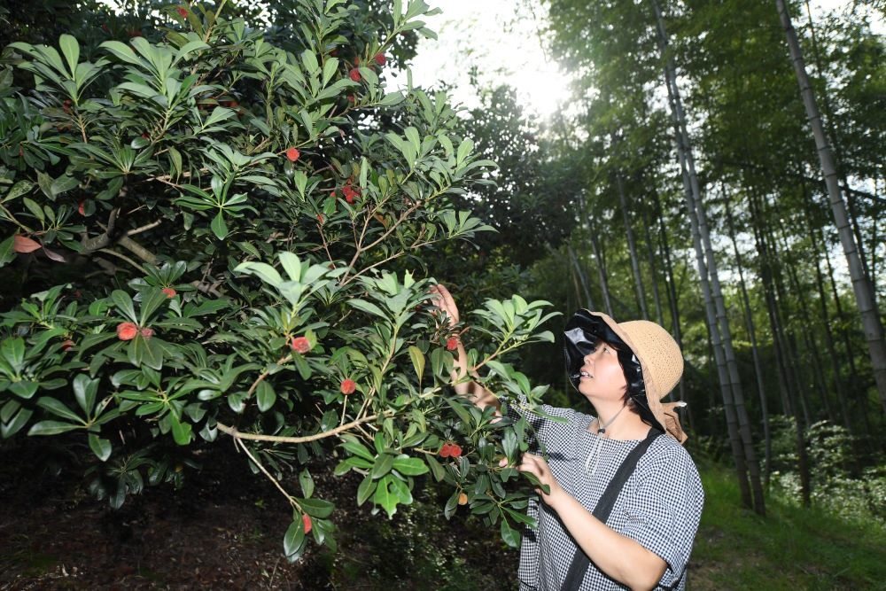 在浙江省仙居縣廣度鄉(xiāng)瓦垚頭村,浙江大學環(huán)境與資源學院教授吳良歡結(jié)對指導的村民鄭文娟在查看楊梅長勢(7月4日攝)。新華社記者 翁忻旸 攝