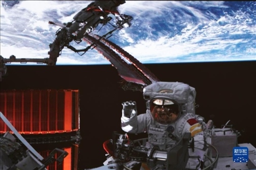 這是在北京航天飛行控制中心拍攝的神舟十六號航天員朱楊柱成功出艙后揮手致意的畫面。