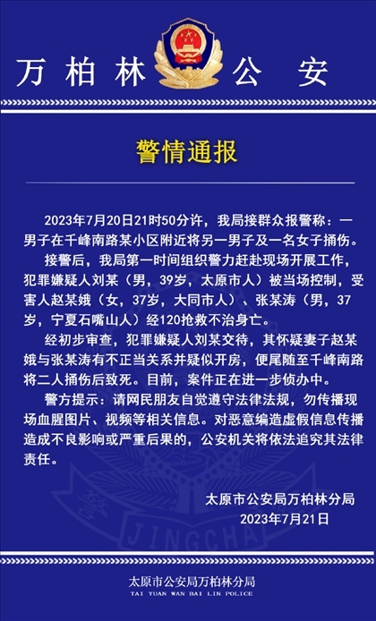 ·太原一男子懷疑妻子與他人有不正當關系,將二人捅傷致死,已被警方當場控制。