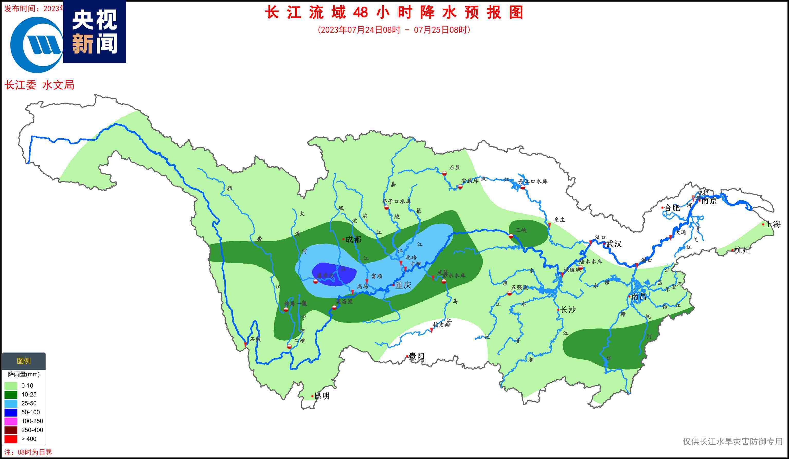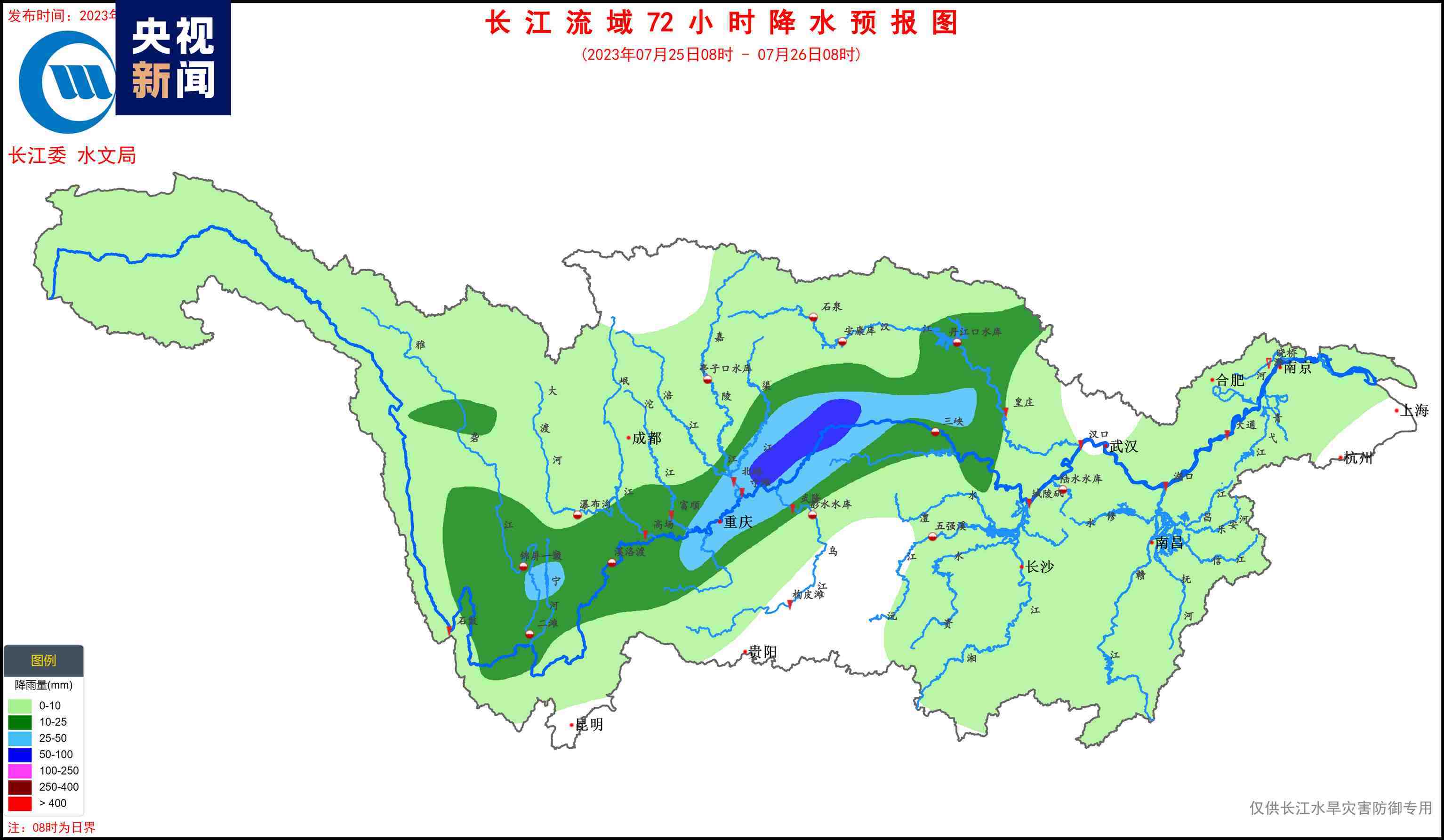 據(jù)水文氣象預報,7月23日,嘉岷流域北部有中雨、局地大雨;24~27日,長江上游干流附近有中到大雨、局地暴雨的降水過程,過程累計面雨量:長江上游干流70毫米,金沙江中下游、雅礱江、岷沱江、渠江、烏江上游30~50毫米。考慮預見期降雨,金沙江中下游、嘉岷流域、赤水河、烏江、三峽區(qū)間將發(fā)生漲水過程,降雨落區(qū)內(nèi)部分中小河流可能發(fā)生超警洪水,局部強降雨引發(fā)山洪災(zāi)害的風險高。