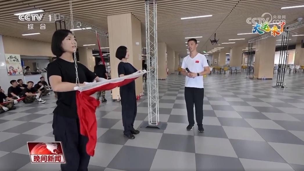 大運(yùn)會(huì)頒獎(jiǎng)儀式升旗手總教官 盛東龍:目的就是希望通過這么一場(chǎng)神圣而莊嚴(yán)的升旗儀式來感染他們,來激發(fā)和增強(qiáng)他們的愛國(guó)情懷,包括他們的使命擔(dān)當(dāng)。