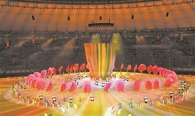 開幕式上,“太陽神鳥”穿越時(shí)空翩飛而至,4只神鳥圍繞旋轉(zhuǎn)的太陽飛翔。12道金色光芒漸次點(diǎn)亮,點(diǎn)亮了整個(gè)體育場(chǎng)。