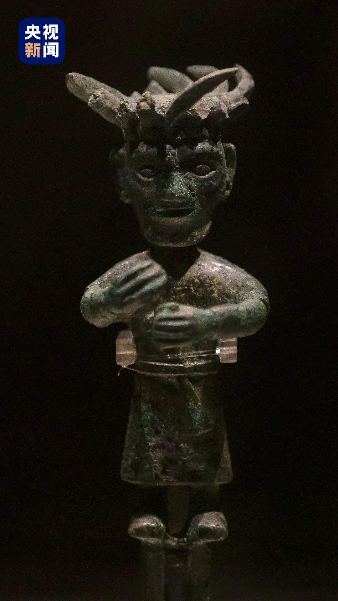 △金沙遺址銅立人。銅立人頭上的渦形帽圈與“太陽神鳥”的太陽圖案相似,象征光芒四射的太陽。
