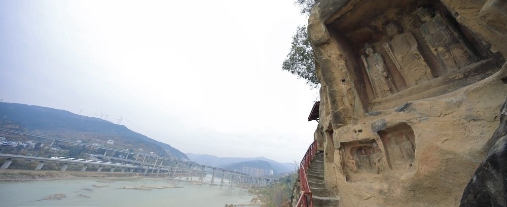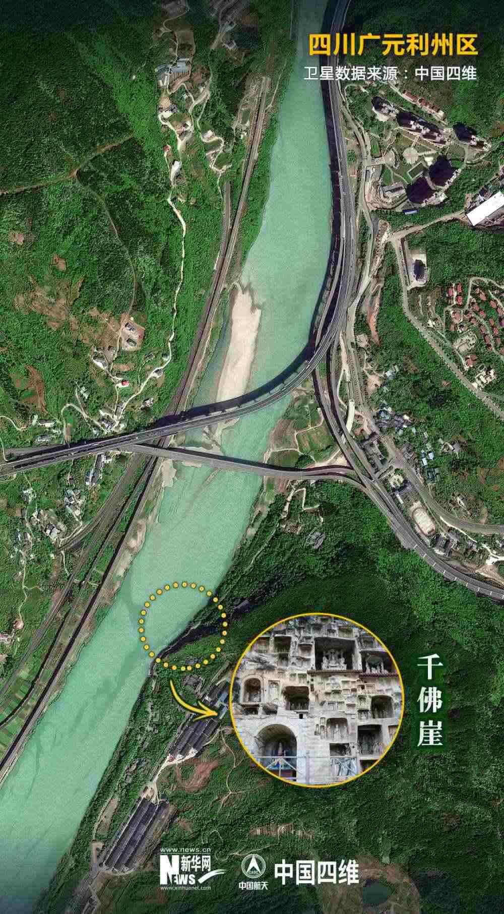值得關注的是,就在千佛崖的河對岸,幾條現代化交通網錯落有致地交織在一起。今日的廣元是名副其實的“交通博物館”。老川陜路、京昆高速、寶成鐵路、西成高鐵、嘉陵江航道在這里交織“奔騰”。橫渡嘉陵江,仿佛穿越古今。