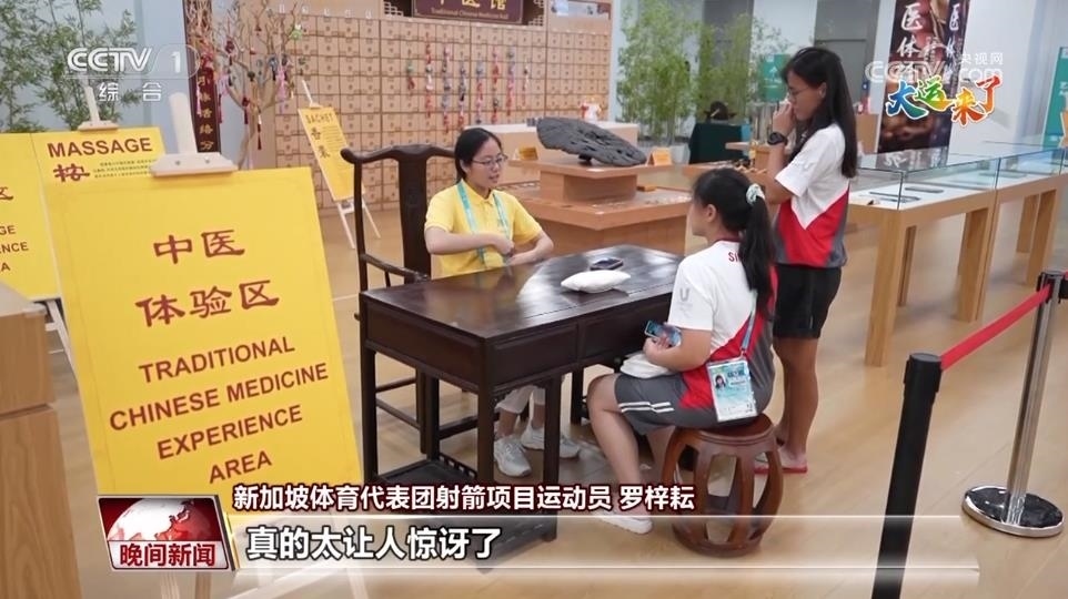 新加坡體育代表團(tuán)射箭項(xiàng)目運(yùn)動(dòng)員 羅梓耘:她把一下脈就什么都知道了。我當(dāng)時(shí)的感覺就是:哇,真的太讓人驚訝了。她把一下脈就知道我所有的壞習(xí)慣,還能給我建議,太神奇了。