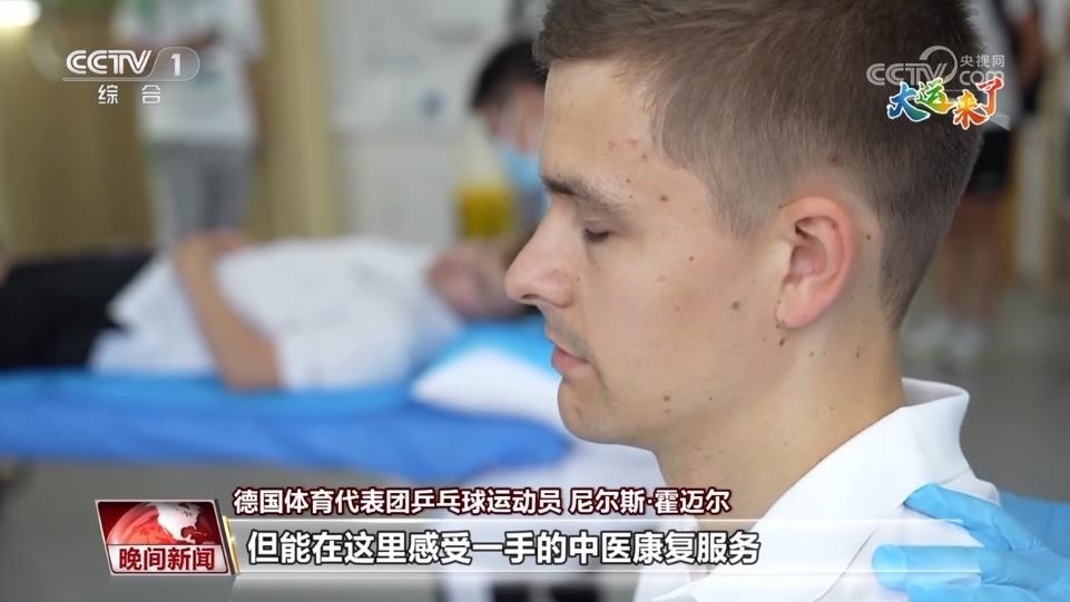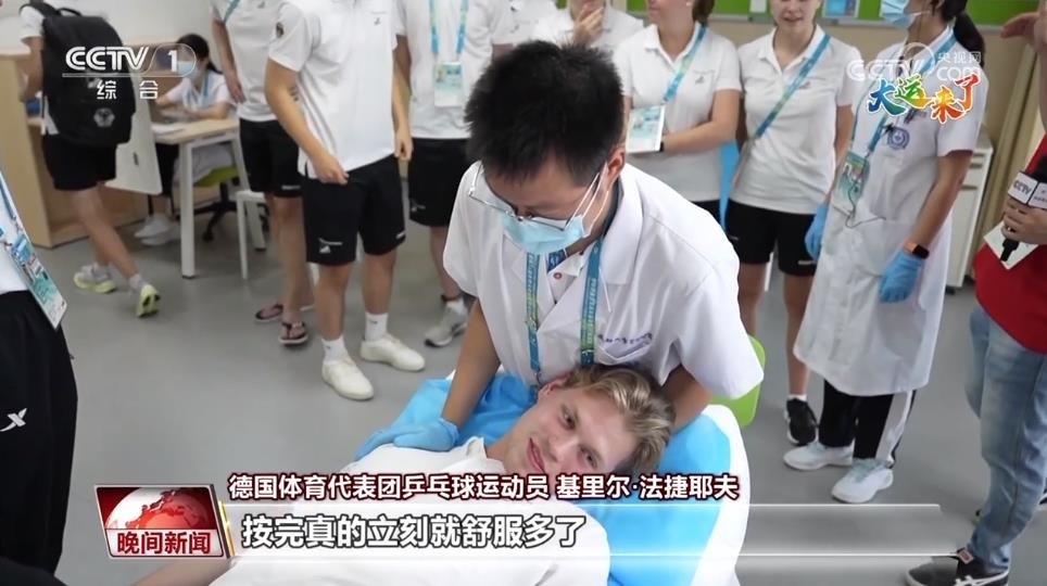 德國體育代表團(tuán)乒乓球運(yùn)動(dòng)員 尼爾斯·霍邁爾:不敢想象在大運(yùn)村還有這么好的醫(yī)療服務(wù),之前完全沒想到。在德國也有一些診所提供類似服務(wù),但能在這里感受一手的中醫(yī)康復(fù)服務(wù),真的太酷了。
