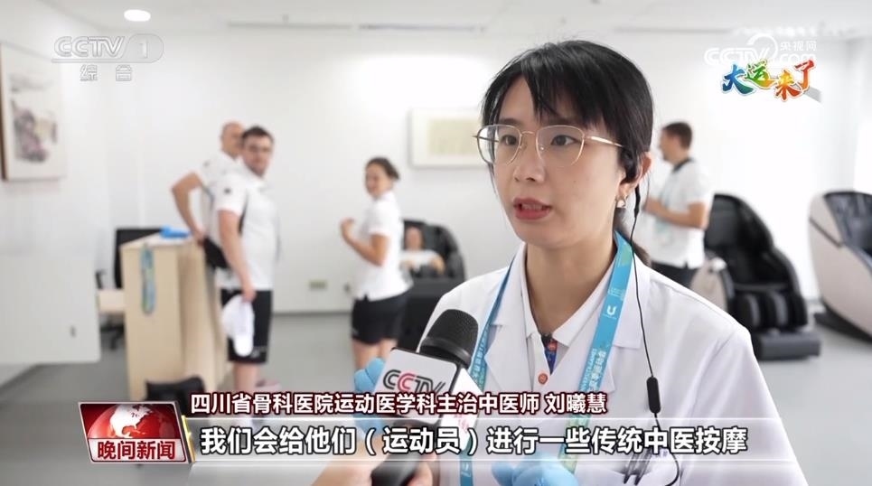 四川省骨科醫(yī)院運(yùn)動(dòng)醫(yī)學(xué)科主治中醫(yī)師 劉曦慧:我們會(huì)給他們(運(yùn)動(dòng)員)進(jìn)行一些傳統(tǒng)中醫(yī)按摩,還有一些特殊的穴位和特殊的治療方法。除此之外,我們還有一些傳統(tǒng)的針灸拔罐,針對性地對他們進(jìn)行一些治療和預(yù)防。