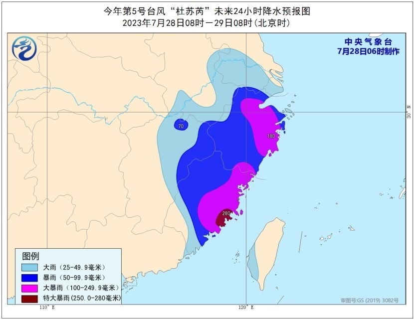 降水預報:28日08時至29日08時,江蘇南部、安徽南部、浙江、福建、江西東部、臺灣島西南部等地的部分地區(qū)有大到暴雨,其中,浙江北部和東部、福建東部等地的部分地區(qū)有大暴雨,局地特大暴雨(250-280毫米)。