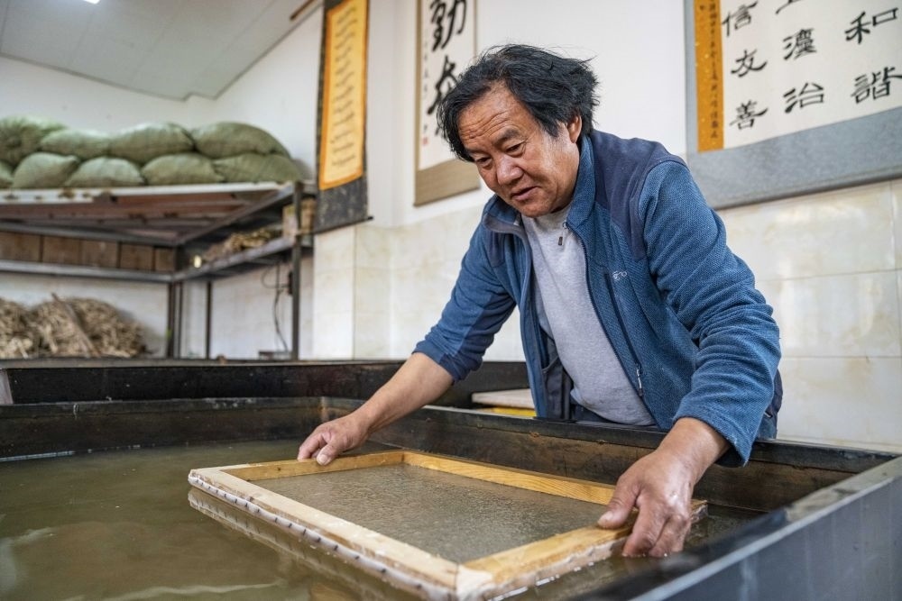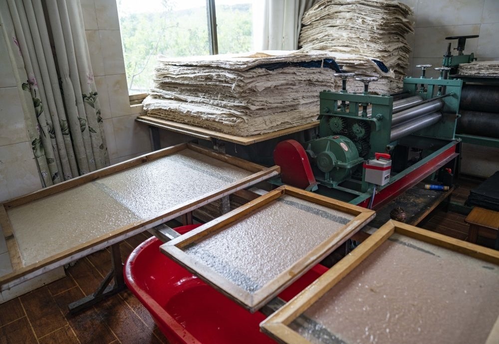 ↑在西藏米林市羌納鄉(xiāng)西嘎門巴村,南迦巴瓦童螺嘎布工藝品農(nóng)民專業(yè)合作社的工作人員正在制作藏紙(7月26日攝)。