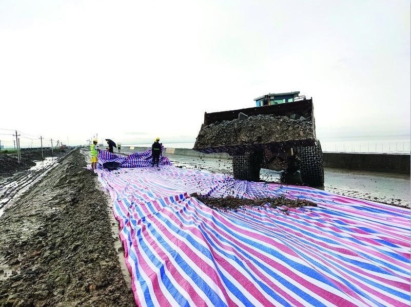 工作人員對(duì)海塘堤壩進(jìn)行加固。(受訪者供圖)