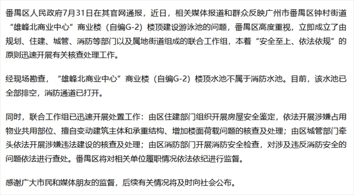 ·廣州番禺通報“樓頂建豪華泳池”:開展涉嫌違法建設核查。