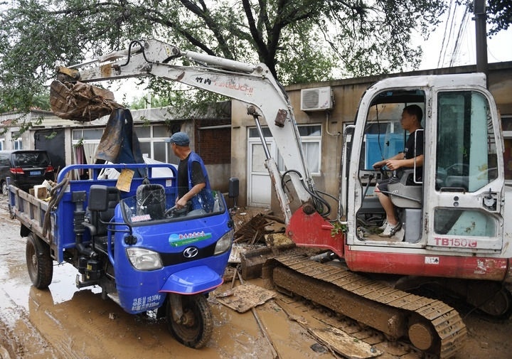 7月31日,在河北省石家莊市井陘縣307國道長崗村段,防汛工作人員駕駛機(jī)械清理淤泥。新華社發(fā)(梁子棟攝)