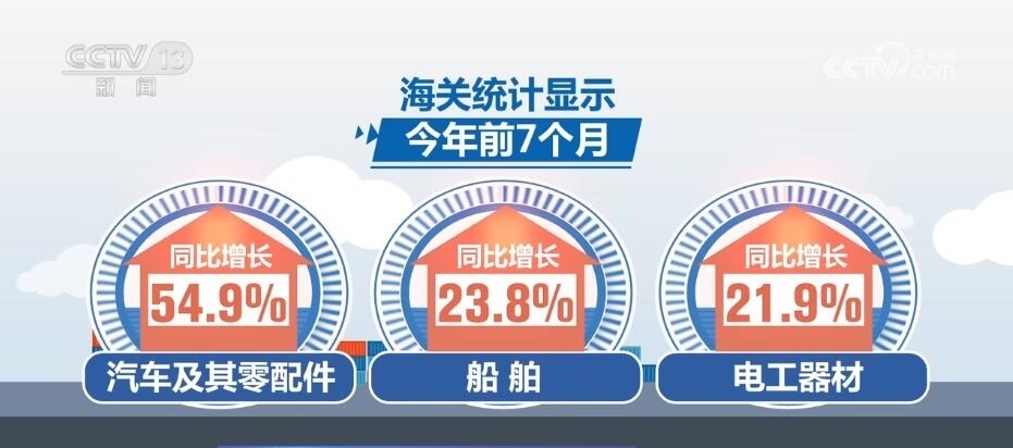 海關(guān)統(tǒng)計(jì)顯示,今年前7個(gè)月,我國(guó)機(jī)電產(chǎn)品出口占比提升,汽車(chē)及其零配件、船舶、電工器材同比分別增長(zhǎng)54.9%、23.8%、21.9%。