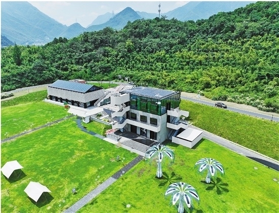 圖為余村未來(lái)圖書館,該建筑主要通過(guò)鋪設(shè)在屋頂上的光伏發(fā)電系統(tǒng)和“光伏樹(shù)”供電(無(wú)人機(jī)照片)。新華社記者 翁忻旸 攝