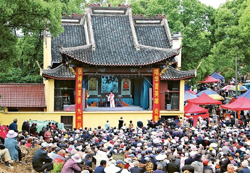 為豐富群眾文化生活,江蘇省南京市高淳區(qū)椏溪街道藍溪村專門邀請杭州青年越劇團來村里演出,讓村民在家門口享受文化大餐。圖為2023年5月7日,藍溪村大山戲樓上,演員正在表演越劇《紅樓夢》。 人民圖片 高曉平/攝