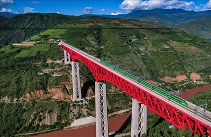 △中老鐵路國際旅客列車行駛在云南元江特大橋上。
