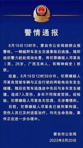 ·云南警方通報(bào)“26歲男子駕越野車連撞多車”:致7人受傷,犯罪嫌疑人有精神病史,已被刑拘。