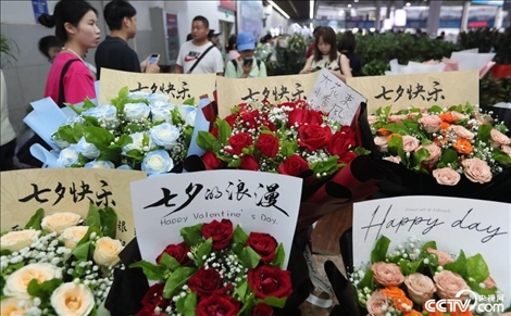 為迎接七夕,昆明斗南花市出現(xiàn)玫瑰花購買熱潮。