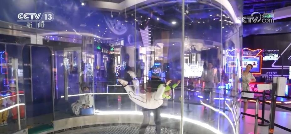 腹部朝下、身體張開、雙腿繃直,在完成這樣一個標準的飛行動作后,就可以在這個空洞中平穩(wěn)飛升到10多米高的空中,模擬體驗跳傘的感覺。
