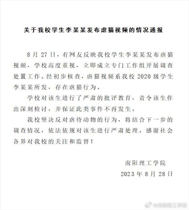 ·南陽理工學(xué)院通報(bào)“學(xué)生發(fā)布虐貓視頻”:責(zé)令其作出深刻檢討,將進(jìn)行嚴(yán)肅處理。