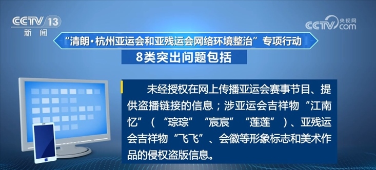 未經授權在網上傳播亞運會賽事節(jié)目、提供盜播鏈接的信息;涉亞運會吉祥物“江南憶”(“琮琮”“宸宸”“蓮蓮”)、亞殘運會吉祥物“飛飛”、會徽等形象標志和美術作品的侵權盜版信息。