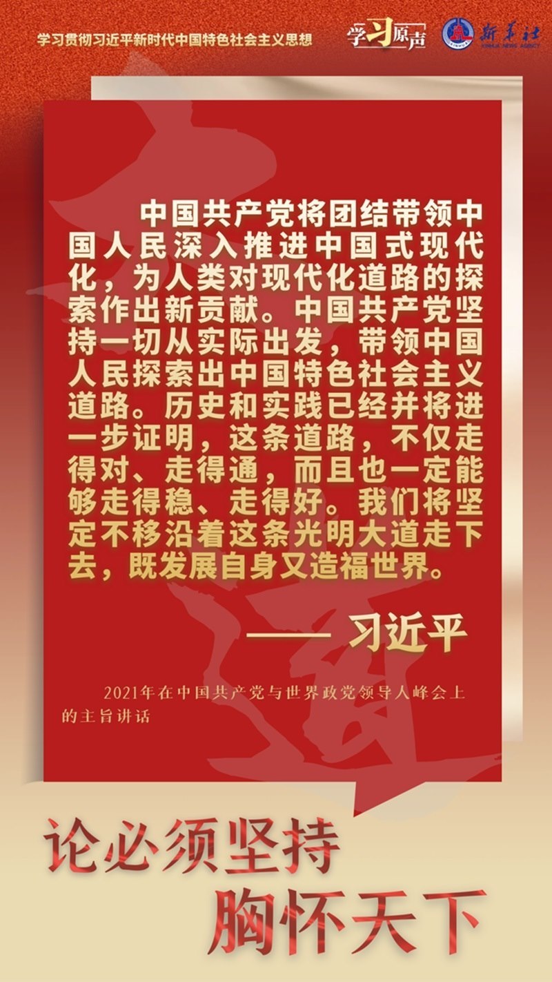 中國共產(chǎn)黨是為中國人民謀幸福、為中華民族謀復(fù)興的黨,也是為人類謀進(jìn)步、為世界謀大同的黨。我們要拓展世界眼光,深刻洞察人類發(fā)展進(jìn)步潮流,積極回應(yīng)各國人民普遍關(guān)切,為解決人類面臨的共同問題作出貢獻(xiàn),以海納百川的寬闊胸襟借鑒吸收人類一切優(yōu)秀文明成果,推動建設(shè)更加美好的世界。