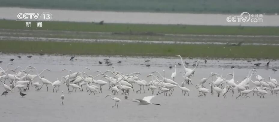 在江西南昌新建區(qū)南磯鄉(xiāng)的南山島附近水域,成群的鷺鳥(niǎo)、斑嘴鴨等候鳥(niǎo)在湖泊中集中覓食,并不時(shí)在空中盤旋列隊(duì),準(zhǔn)備南遷。今年夏季,鄱陽(yáng)湖水位漲跌交替,湖內(nèi)草洲沙灘顯露,為各種鳥(niǎo)類棲息覓食,提供了良好的環(huán)境。