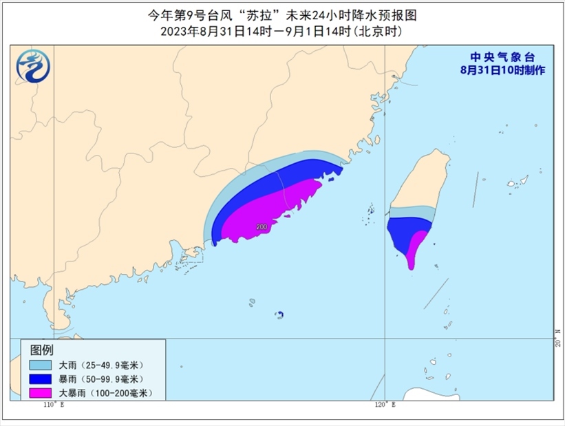 降水預(yù)報:8月31日14時至9月1日14時,廣東東部、福建南部、臺灣島中南部等地的部分地區(qū)有大到暴雨,其中,廣東東南部、福建東南部、臺灣島東南部等地部分地區(qū)有大暴雨(100-200毫米)。