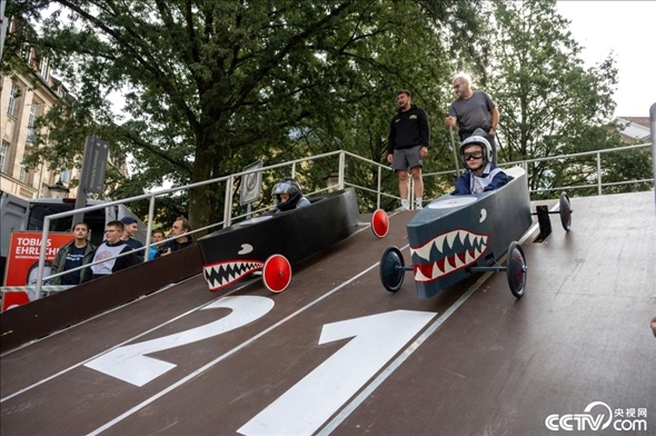 德國(guó)巴伐利亞州科堡舉行肥皂盒汽車比賽。參賽者將車子打扮成各種奇怪的造型,在沒有動(dòng)力的情形下滑下坡道,完成比賽。