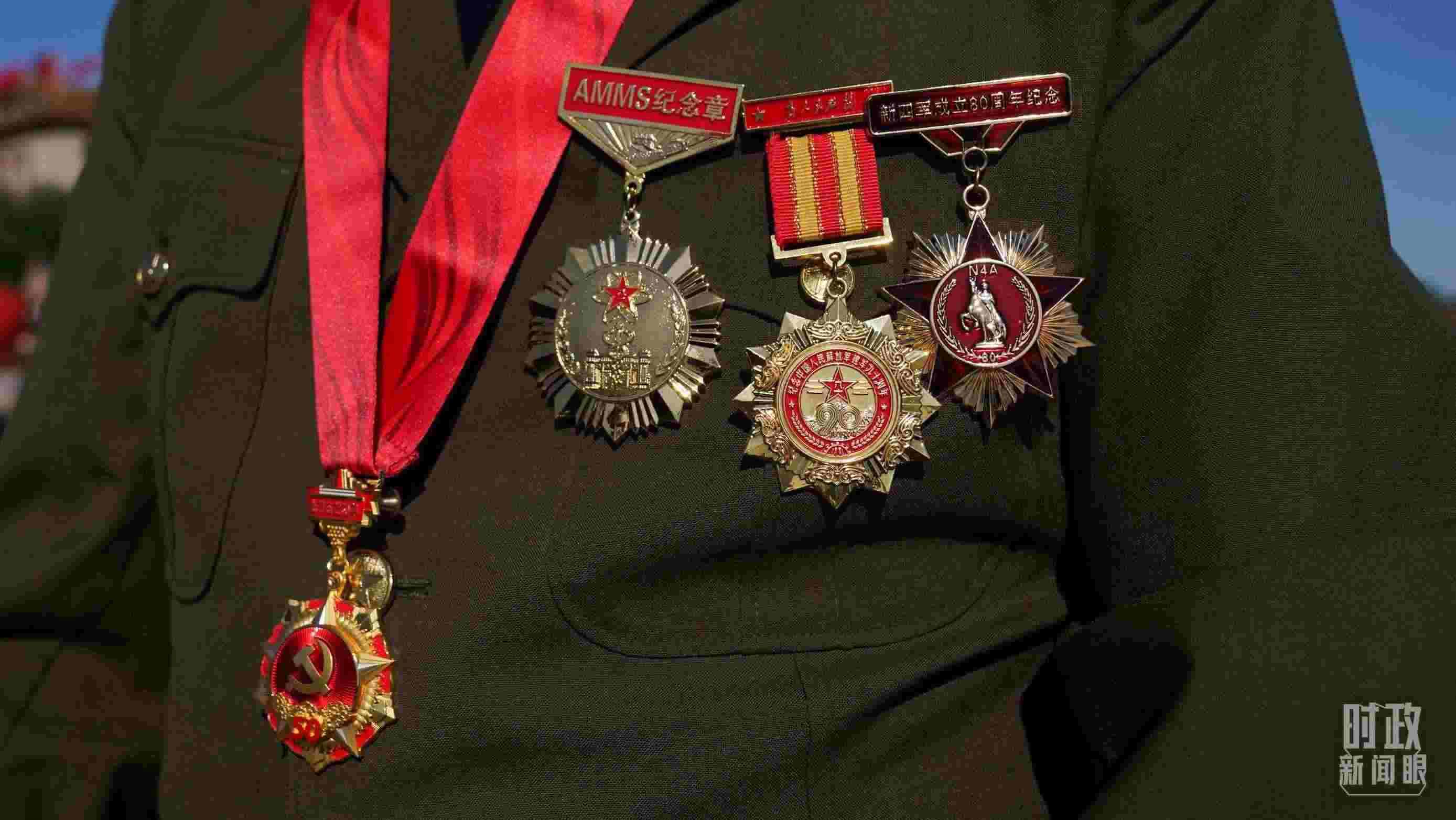 △儀式現(xiàn)場(chǎng),老戰(zhàn)士代表身上佩戴多枚紀(jì)念章。(總臺(tái)國(guó)廣記者李晉拍攝)