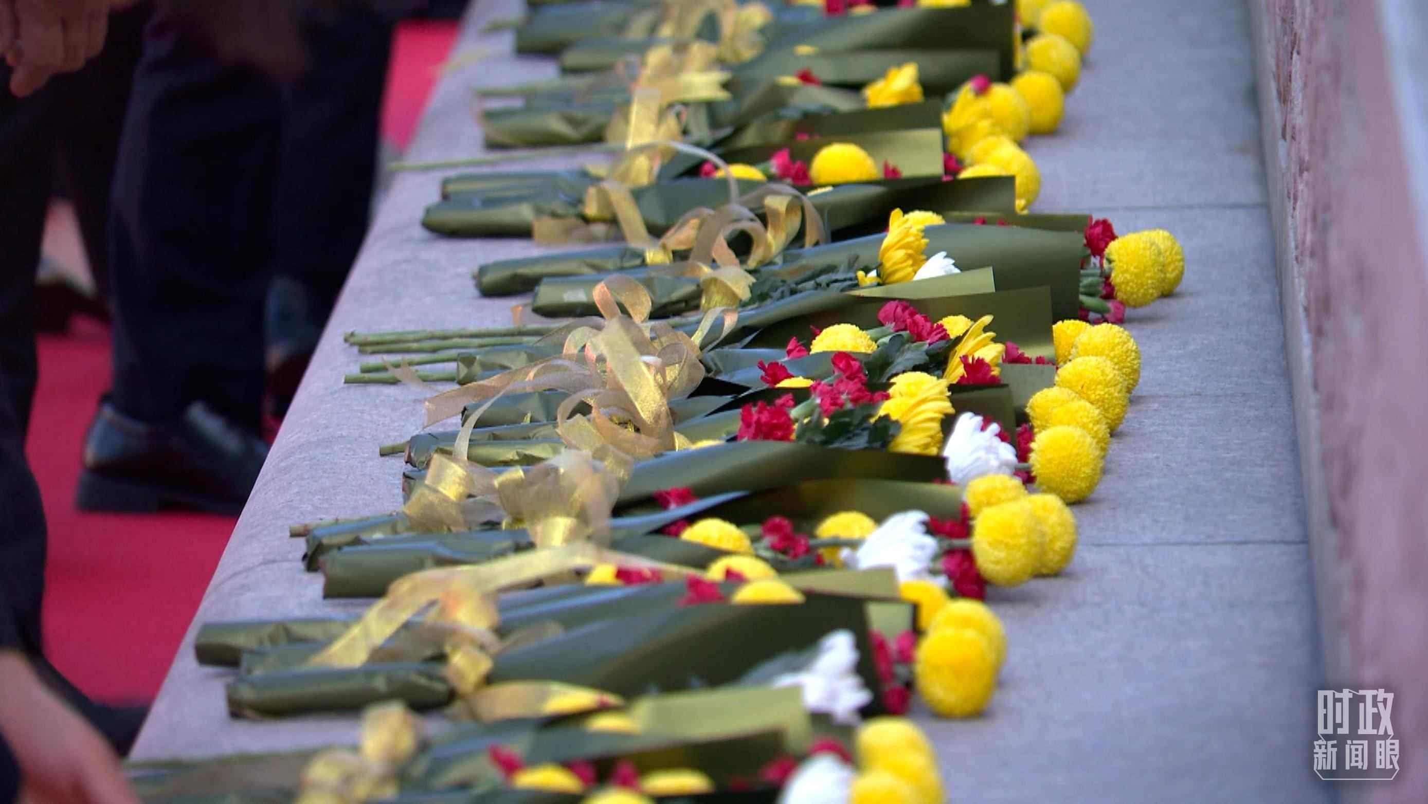 △儀式現(xiàn)場(chǎng)共有9個(gè)大型花籃。(總臺(tái)央視記者周倜拍攝)
