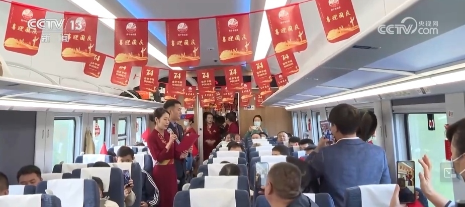 車廂內掛滿了國慶主題的旗幟、窗花,“天路格?;ā蔽乃囆》株爴]動著手中的五星紅旗,與旅客齊聲合唱《我和我的祖國》,還表演了詩朗誦、快板等節(jié)目,贏得了現(xiàn)場旅客的掌聲。