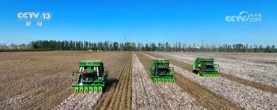 瑪納斯縣南靠天山山脈,土壤肥沃,光熱水土資源豐富,適宜種植棉花,是新疆的重要棉花產(chǎn)區(qū),也是國家級優(yōu)質商品棉生產(chǎn)基地,今年當?shù)孛藁ǚN植面積74萬畝。在瑪納斯縣涼州戶鎮(zhèn)呂家莊村的萬畝棉田里,三臺新引進的棉花采收打包一體機正在采收棉花,采棉機能夠高效快速地將棉花從棉稈上脫離,采凈率高達95%以上,一臺采棉機平均每天可采收700多畝棉花,相當于1000名拾花工勞動量的總和。