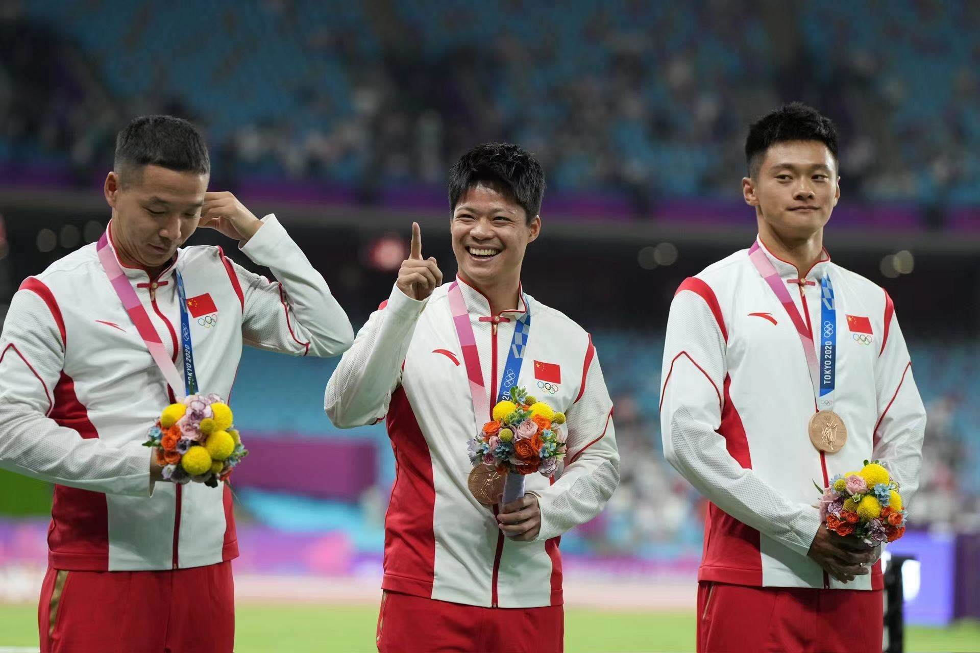 蘇炳添、謝震業(yè)、吳智強(qiáng)、湯星強(qiáng)參加了東京奧運(yùn)會田徑男子4×100米接力決賽,并在比賽中第四個(gè)沖過終點(diǎn)。去年2月,國際體育仲裁法庭裁定英國運(yùn)動(dòng)員烏賈在東京奧運(yùn)會期間違反了反興奮劑條例,取消英國隊(duì)男子4x100米接力成績并收回所獲銀牌,中國男子4x100米接力隊(duì)因此遞補(bǔ)獲得銅牌。這是中國男子4x100米接力隊(duì)首次在奧運(yùn)會上獲得獎(jiǎng)牌。