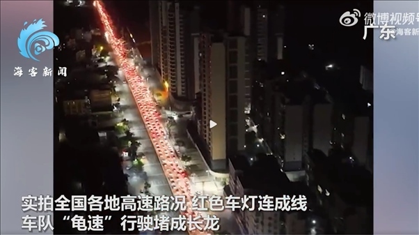 也有有網(wǎng)友曬出高速路況畫(huà)面,車(chē)隊(duì)“龜速”行駛堵成長(zhǎng)龍,并表示“特意提前三天回去。