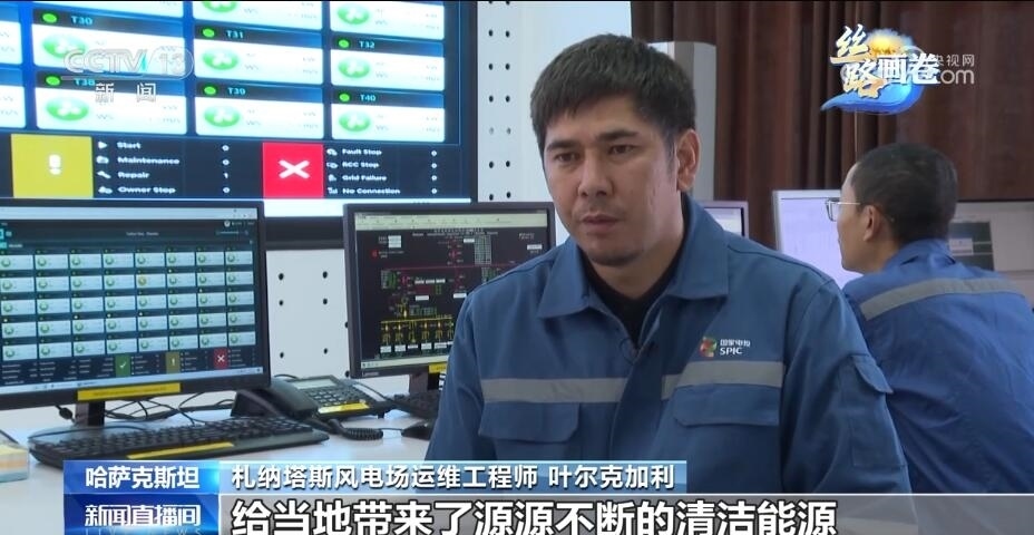 總臺(tái)記者 張譽(yù)耀:這里就是札納塔斯,哈薩克斯坦最大的風(fēng)力發(fā)電場(chǎng)之一,像我身后這樣一座風(fēng)能發(fā)電機(jī)能滿足當(dāng)?shù)丶s4000戶家庭的用電需求,而我身后一共有40座這樣的風(fēng)能發(fā)電機(jī),也就是說能夠滿足當(dāng)?shù)?6萬戶家庭的用電需求。正是這一座座轉(zhuǎn)動(dòng)的風(fēng)能發(fā)電機(jī),點(diǎn)亮了札納塔斯這座小城的日常生活。