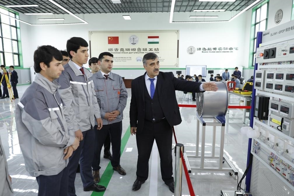 4月12日,在塔吉克斯坦首都杜尚別的魯班工坊內(nèi),塔方教授向?qū)W生講解綠色電能展示平臺的功能與使用方法。新華社發(fā)(奧斯帕諾夫攝)