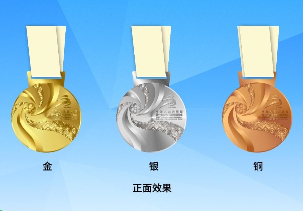 首屆學青會獎牌正面采用繡球、壯錦等廣西元素,以繡球為設計焦點,通過壯錦飄帶向外綻放,如一朵盛開的鮮花,表達歡迎四方友人共赴學青盛會的美意;獎牌背面以廣西銅鼓鼓面為原型,中心太陽紋象征著年輕人的活力和熱情,四方配以圖騰鳥,有著吉祥的寓意;外圈環(huán)繞了學青會的英文名稱和銅鼓經典紋飾云雷紋。獎牌整體寓意“團結、活力、綻放”。