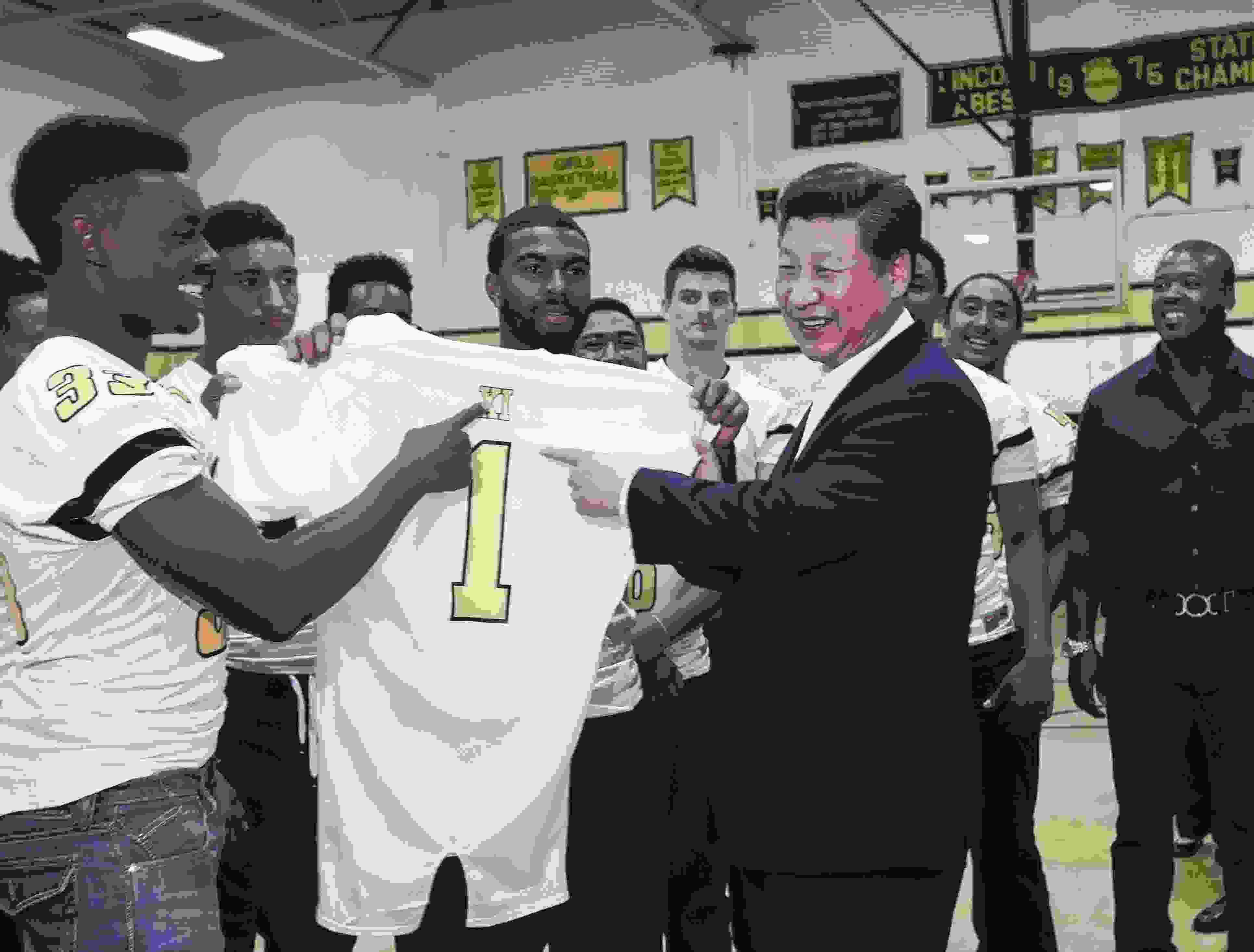 △ 2015年9月23日,國家主席習近平參觀美國塔科馬市林肯中學。這是習近平接受學生們贈送的橄欖球衣。