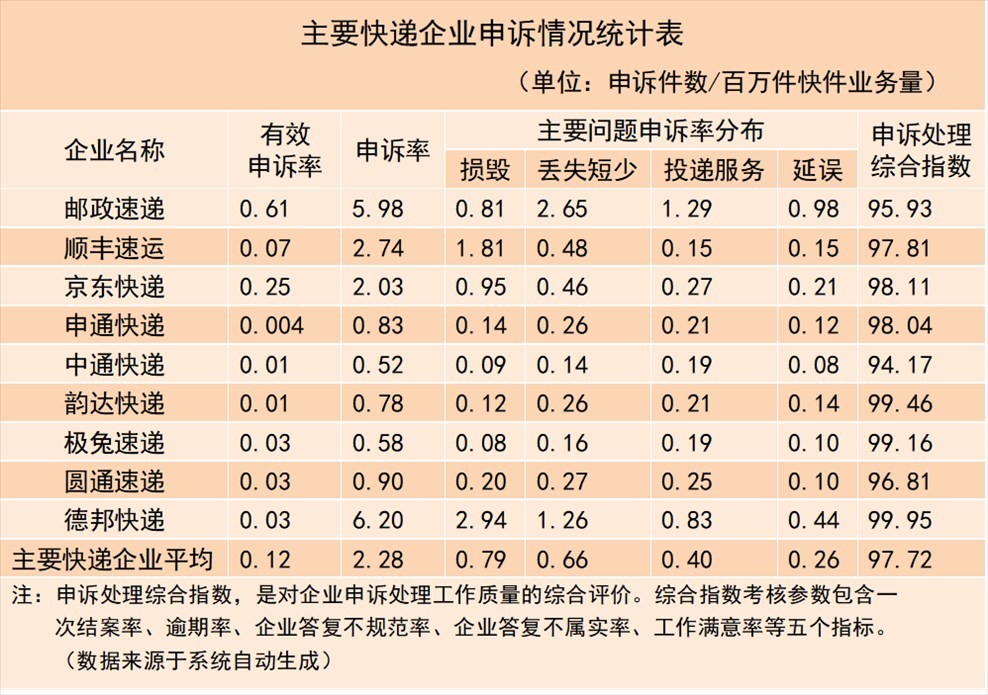 3.主要快遞企業(yè)申訴情況。主要快遞企業(yè)申訴率(百萬件快件業(yè)務(wù)量)平均為2.28,有效申訴率平均為0.12。用戶對(duì)快遞服務(wù)申訴主要問題中,快件損毀申訴率平均為0.79,快件丟失短少申訴率平均為0.66,投遞服務(wù)申訴率平均為0.40,快件延誤申訴率平均為0.26;主要快遞企業(yè)申訴處理綜合指數(shù)平均為97.72,高于平均值的有6家,低于平均值的有3家。