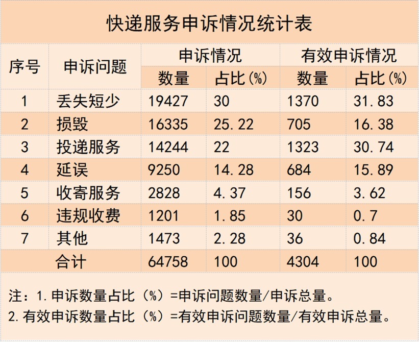 三、快遞服務(wù)申訴情況1.快遞服務(wù)申訴問題數(shù)量與類別情況。用戶對(duì)快遞服務(wù)問題申訴64758件,其中有效申訴4304件,占比6.65%。有效申訴涉及的主要問題依次是快件丟失短少、投遞服務(wù)和快件損毀,分別占有效申訴總量的31.83%、30.74%和16.38%。